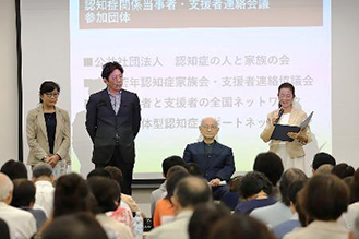 「遠距離介護で離れていても、日ごろの些細な変化に周囲が気づくことが重要」、「認知症になってみて味わった心ない偏見をなくしていくための講演活動がしたい」、「地方においては専門医が不足し、認知症関連の組織団体も少なく悩みを共有する機会がない」、「信頼できる医師を探し、症状に合った薬が欲しいと声をあげることも大事」など、心の交流や支援のネットワークを広げ、認知症になっても安心できる社会づくりへ向けての率直な意見や議論が交わされました。